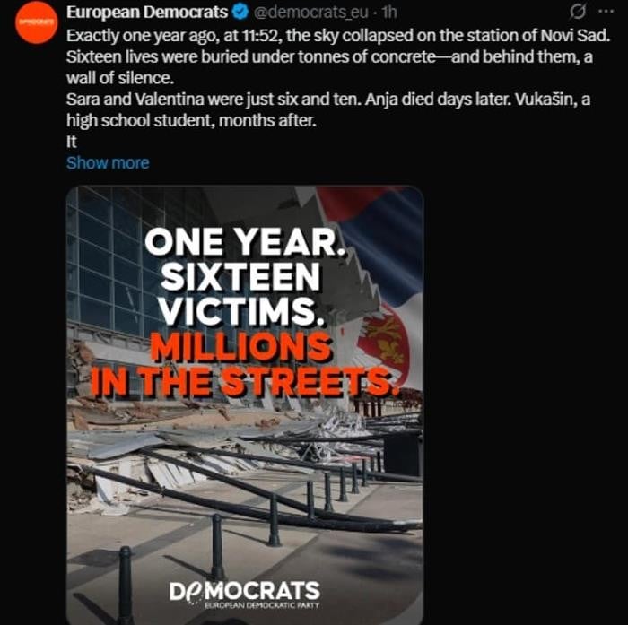 „Точно пред една година во 11:52 часот, небото се урна врз железничката станица во Нови Сад, шеснаесет животи беа закопани под тони бетон, а зад нив ѕид од тишина“, напишаа Европските демократи на мрежата X, заедно со слика со наслов „една година, шеснаесет жртви, милиони на улиците“.