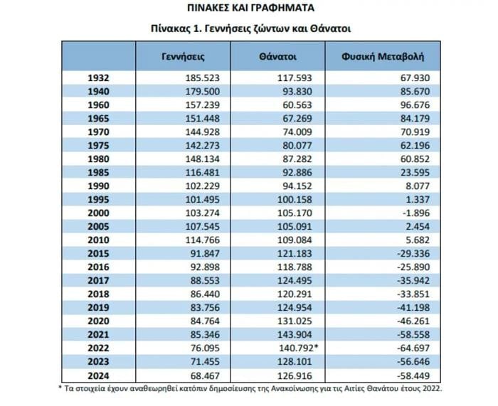 Во 2024 година во Грција биле родени 68.467 деца што претставува пад од 4,2 отсто во однос на една година претходно, а воедно е и најниска бројка од 1932 година, според демографските податоци од грчката служба за статистика, јави дописничката на МИА од Атина.
