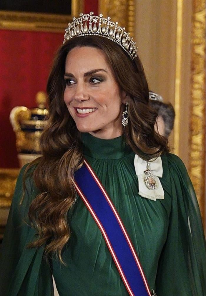 Кејт целиот изглед го заокружила со обетки што ѝ припаѓале на кралицата Елизабета II.