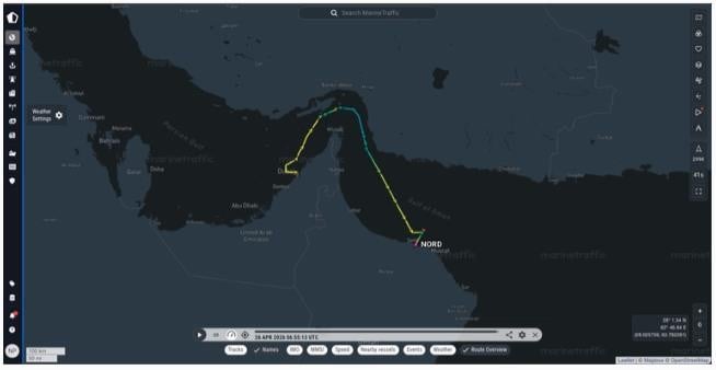 Според „MarineTraffic“ и „Vesselfield“, јахтата „Nord“ од 142 метри испловила од Дубаи и поминала низ теснецот ноќта на 25 април на пат кон Оман.