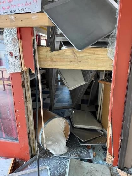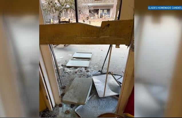 Според снимката од надзорната камера, животното ја скршило стаклената врата, ги превртело полиците и извадило надвор садови со благи работи.