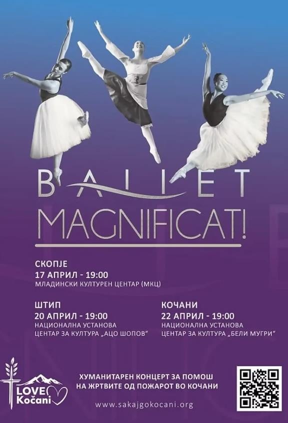 „Ballet Magnificat“ во нашата држава ги води Здружението на граѓани „Сакај го  Кочани“. Балетската група од САД кај нас месецов имаше два настапи со хуманитарен предзнак - на 17 април во МКЦ во Скопје  и на 20 – ти во ЦК „Ацо Шопов“ во Штип.