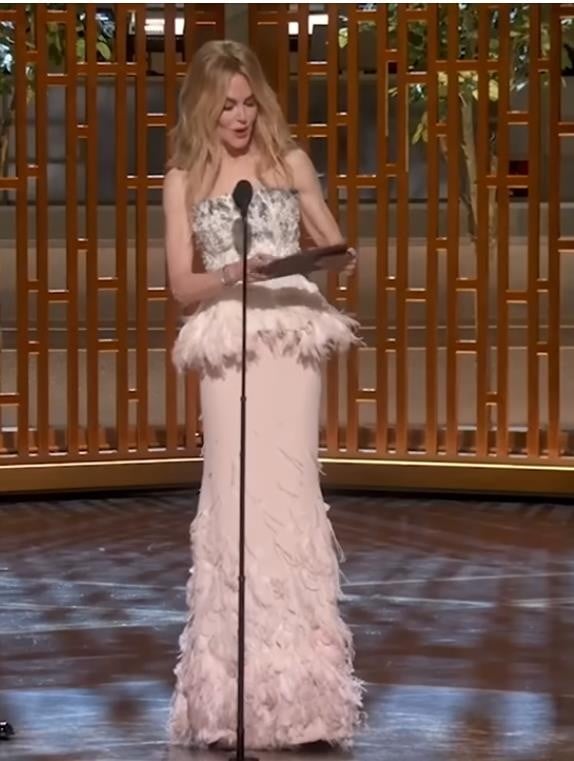 Оригиналниот модел има висока јака, но беше променет во издание без прерамки, за Кидман за да изгледа поелегантно и посоодветно за вчерашната свечена пригода. Дивата го дополни својот изглед со модни додатоци од „Шанел“ - обетки и 18-каратен прстен од бело злато украсен со бисери и дијаманти.