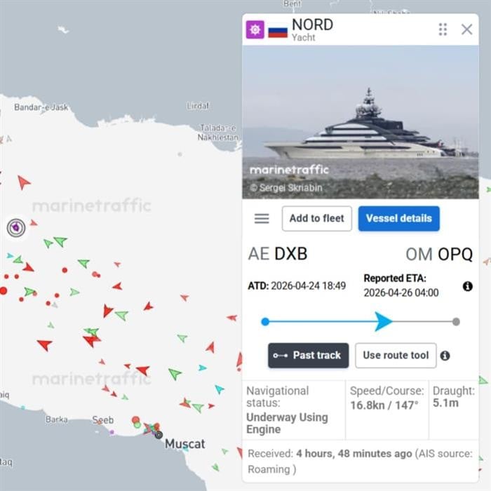 Јахтата Норд, долга речиси 142 метри, исплови од Дубаи во Обединетите Арапски Емирати синоќа и помина низ клучен воден пат во текот на ноќта, според податоците од „MarineTraffic“, пишува „CNN“.