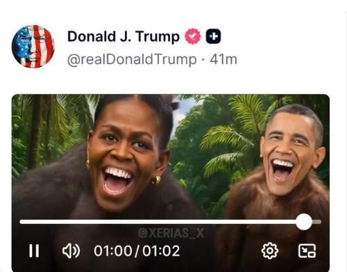 На неа се прикажани насмеаните лица на поранешниот претседател и првата дама качени на телата на примати како се нишаат во џунглата на мелодијата на „the lion sleeps tonight“.